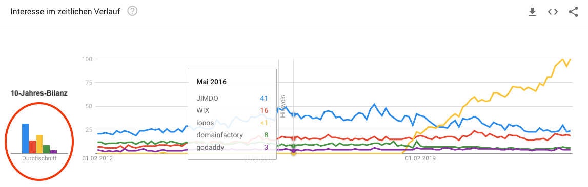 Von allen Anbietern gibt es einen, der aufgrund der Dauer seines Angebotes hervorsticht. Bei den Suchanfragen ist JIMDO klarer Spitzenreiter in der 10-Jahres-Bilanz in Deutschland. Hervorgegangen aus einer Kooperation mit United Internet sind die Hamburger seit 2007 mit ihrer Do-it-Yourself-Homepage am Markt. Seit ein paar Jahren hat United Internet mit dem eigenen Produkt IONOS MyWebsite JIMDO zumindest in den Suchanfragen hinter sich gelassen. Wir werden hier deshalb nicht nur auf die Vorteile des deutschen Softwareanbieters JIMDO zu sprechen kommen, sondern auch auf die Nachteile.