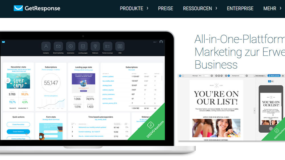 - aufgrund dieser Funktionalität ist GetResponse auch für Landingpages, Webinare und Marketing-Automatisierung gedacht