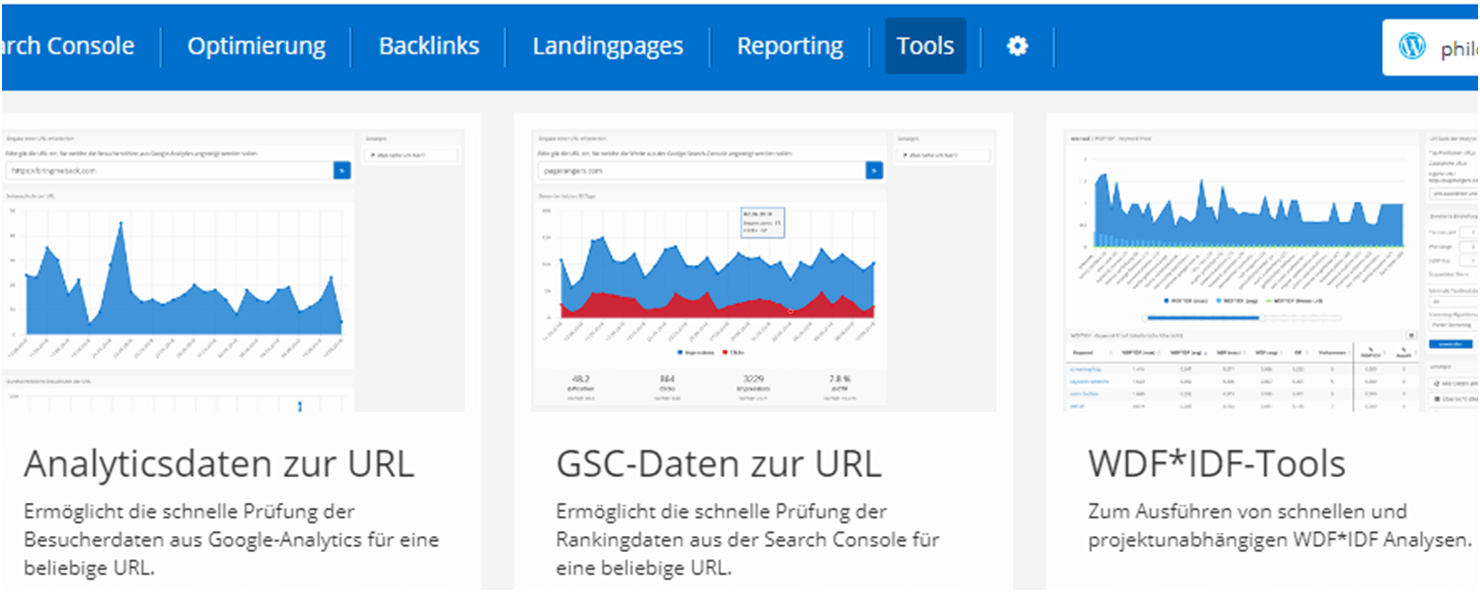 PageRangers stellt verschiedene Analyse-Tools zur Verfügung: Allerdings brauch man für diese ein Google-Konto. Der Vorteil ist, dass man nicht nur seine eigene Seite, sondern beliebige Seiten analysieren kann. Für Leute, die kein Google-Konto haben und sich auch keines erstellen möchten (beispielsweise strikte Datenschützer) sind diese Tools jedoch wenig hilfreich.