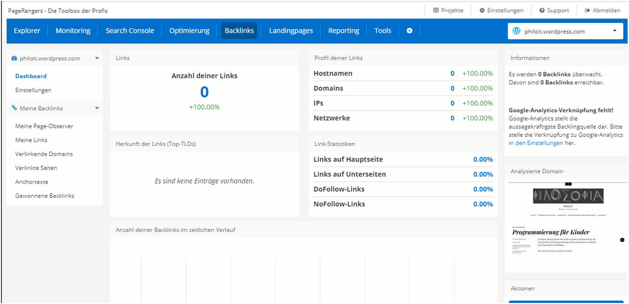 PageRangers hat alle externen Verlinkungen Eurer Seite im Blick und gewichtet diese anhand mehrerer Qualitätsfaktoren. Dadurch kann man selbst Backlinks überwachen, deren Qualität bewerten und zusätzlich manuelle Backlinks eintragen. Mit Hilfe von PageRangers lassen sich auch die Backlinks der Konkurrenz betrachten. Um die eigenen Backlinks analysieren zu lassen, benötigt man eine Google-Analytics-Verbindung. Obwohl diese Funktion sehr mächtig ist, stellt sie gegenüber anderen Online-SEO-Tools keine Besonderheit dar. Auch Software wie XOVI oder Ryte besitzen ein mächtiges Backlink-Modul.