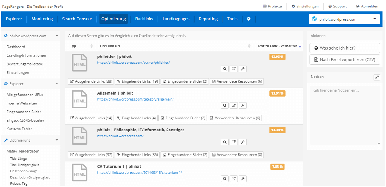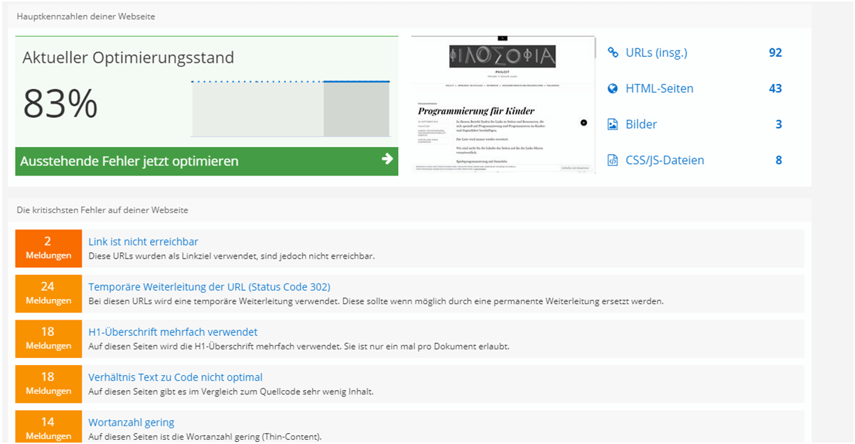 Die Funktion Optimierung dient dazu die technischen Faktoren zur Suchmaschinenoptimierung zu verbessern und berücksichtigt bei seinen Analysen Server-Daten, Inhalte, Seitenstruktur und Seitenaufbau. Außerdem bietet diese Sektion einen Meta-Daten Checker, um die CTR zu verbessern. Ein Einführungsvideo zum Optimierungs-Tool von PageRangers findet Ihr auf der offiziellen Website unter Toolbox > Optimierung.