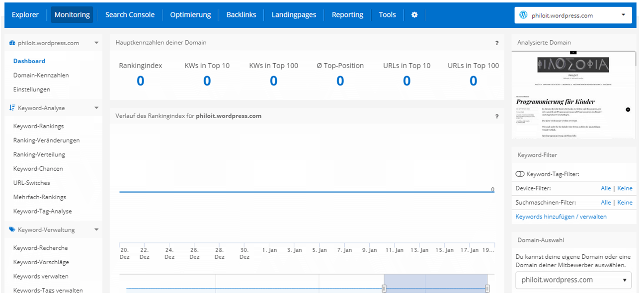 Die Monitoring-Option bietet einen Überblick über die Rankings der eigenen Keywords sowie über Entwicklungen dieser Rankings. Das gilt auch für ausgewählte Mitbewerber.