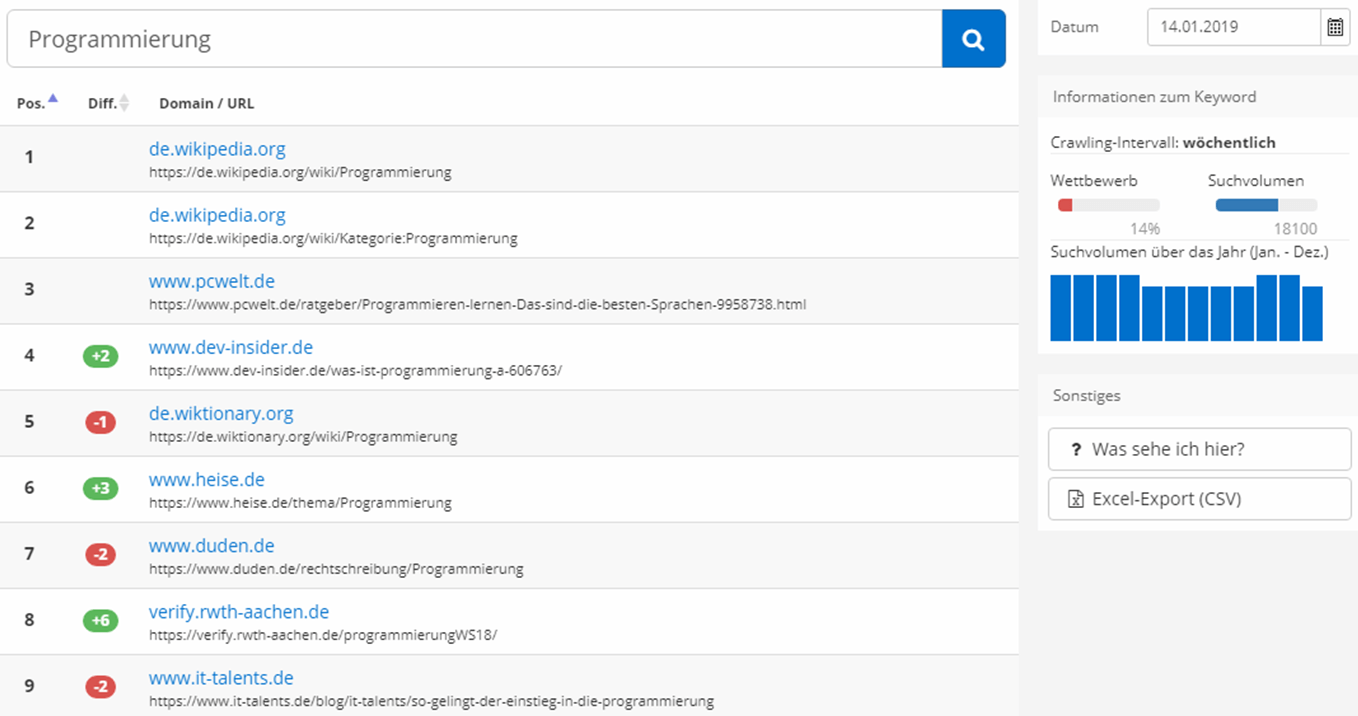Die Funktion Keyword-SERP liefert Nutzern Informationen über die Veränderungen der Ergebnisse in den Suchmaschinenergebnissen (SERPs) zu genau einem bestimmten Keyword im Vergleich zur Vorwoche. Zusätzlich wird das durchschnittliche Suchvolumen sowie das monatliche Suchvolumen von PageRangers angezeigt, dadurch können Trends und saisonale Schwankungen erkannt werden.