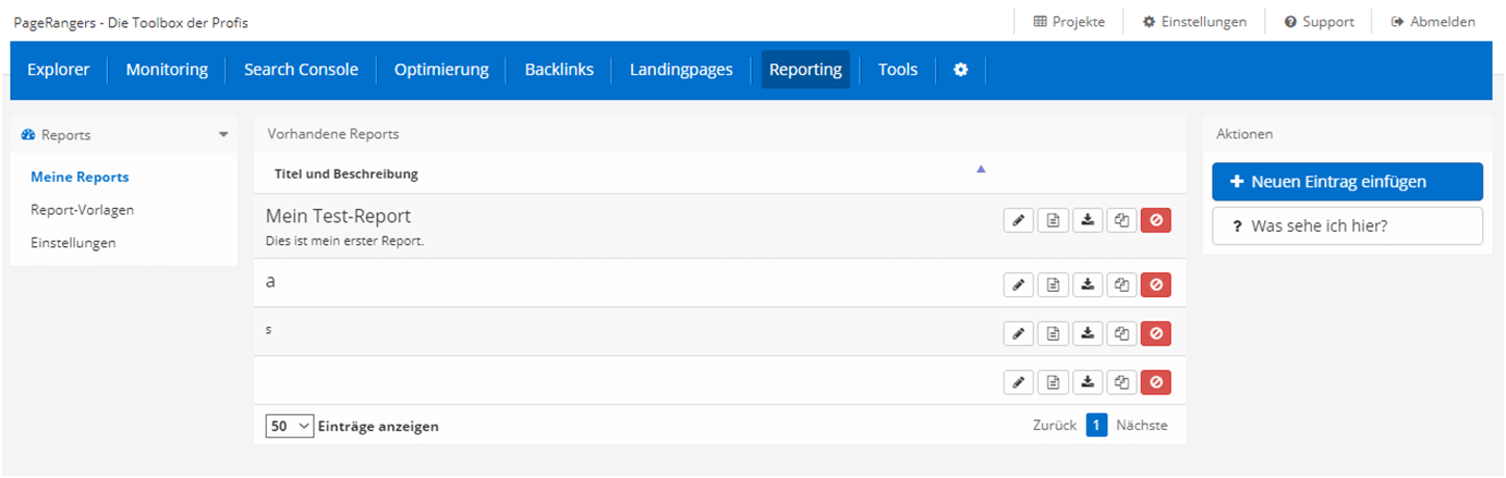 Unter Meine Reports werden einem alle Reports, die man angelegt hat, angezeigt. Wichtig ist, dass PageRangers Reports nicht wiederherstellen kann, nachdem sie gelöscht worden sind. Es handelt sich also um einen endgültigen Löschvorgang. Ob der Kundenservice etwas wiederherstellen kann, ist uns nicht bekannt. Es ist jedoch als letzter Ausweg denkbar. Reports kann man anlegen, bearbeiten, kopieren, herunterladen und löschen. Ist einem Report noch keine Website/URL zugeordnet und man möchte sich eine Vorschau ansehen, so muss man den Link zur entsprechenden Website angeben.