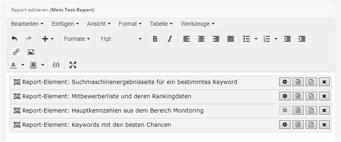 Man kann seinen Reports verschiedene Elemente hinzufügen, die im Report angezeigt werden sollen. Für das Monitoring bietet PageRangers eine Darstellung des Verlaufs des Rankingindex, sowie für Hauptkennzahlen und eine Keyword-Liste. Diese Keyword-Liste zeigt ausgewählte Keywords inkl. Position, Seite, Suchvolumen und berechnetem Wettbewerb an. PageRangers zeigt einem, wenn gewünscht, auch die Veränderungen der Keyword-Rankings an, wobei man sich beliebig viele verbesserte oder verschlechterte Positionen und neue oder verlorene Rankings ansehen kann. PageRangers kann auch die Keywords nach ihrem Potential hinsichtlich Position, Chance, Wettbewerb oder Suchvolumen vorsortieren. Zusätzlich bietet die Online-SEO-Software folgende Reporting-Optionen: