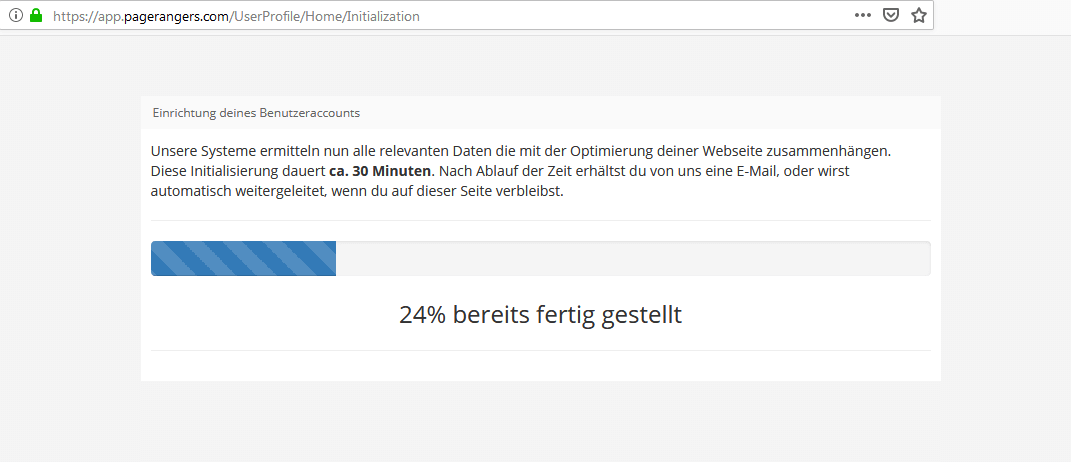 Nach der Registrierung erhält man zunächst seine Zugangsdaten. Anschließend muss man sich mittels Verifizierungscode authentifizieren. Diesen erhält man via SMS oder durch Anruf bei der Hotline. Man muss auch die später verwendete Domain angeben. Für diese werden dann die relevanten Daten für die Optimierung automatisch ermittelt. Das kann bis zu 30 Minuten dauern. Obwohl das Setup meist etwas schneller geht, sollte man auf jeden Fall einige Minuten dafür einplanen.