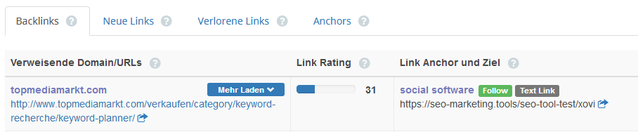 Besonders spannend ist hier die Auflistung aller vorhandenen Backlinks. Das ist bei vielen SEO Tools eine mächtige Funktion. Dort werden alle verweisenden Domains, die exakte Seite von der aus verlinkt wird sowie ein errechnetes Ranking der Relevanz dieses Backlinks angezeigt. Man kann beim Anzeigen der Backlink-Informationen zwischen den folgenden Subkategorien unterscheiden: