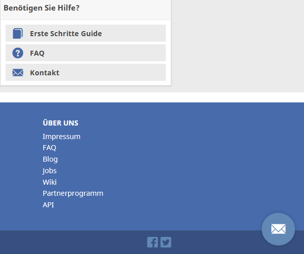 Alle Hilfeoptionen auf einen Blick: ein Guide, die FAQs oder Direktkontakt sowie Blog und Wiki im Footer-Menü. Außerdem Links zu Social-Media-Kanälen.