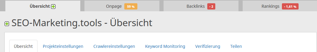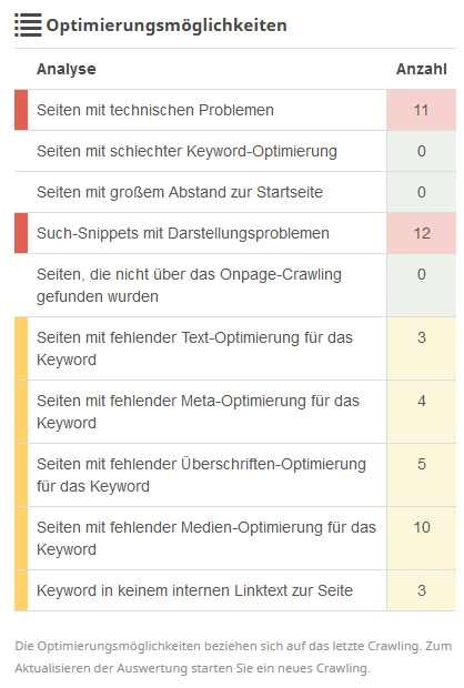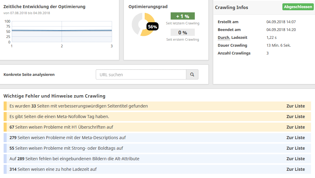 In jeder der Onpage-Unterkategorien wird zu Beginn der Seite der Optimierungsgrad angezeigt. Dieser wird mit dem letzten und dem ersten Crawling-Vorgang verglichen. Das erleichtert Analysen anhand von Fortschrittsdiagrammen. Die Aussagekraft der Werte schwankt jedoch, da es viele Aspekte gibt, die das SEO Tool crawlt, vom Website-Betreiber aber womöglich bewusst nicht verändert werden sollen. Ein Beispiel dafür wäre die Funktion der „verbesserungswürdigen Seitentitel“. Obwohl optimierte Seitentitel nützlich sein können, gibt es hier viele Fehlalarme. Besonders wenn es um Wortwiederholungen geht. Das kann bei Abkürzungen oder Begriffen wie „SEO“ durchaus sinnvoll und somit kein Fehler sein. Solche Punkte als falschen Alarm zu markieren, gibt es leider nicht.
