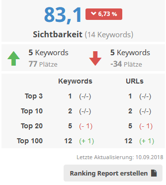 Diese Kategorie begrüßt mit der Anzeige eines Sichtbarkeitstrends des ausgewählten Projekts. Änderungen zum Vortag – auf Wunsch auch zur Vorwoche, dem Vormonat oder einem Wunschzeitraum – werden im Stil eines Aktienkurses angezeigt. Schade ist dabei, dass man nicht sieht, wie ein Keyword gerankt hat, wenn es ganz aus der Wertung fällt. In dem Fall wird das Keyword rot markiert und mit „out“ gekennzeichnet. Das ist nicht unproblematisch, zumal es je nach Situation unterschiedliche Auswirkungen haben kann. Während ein Keyword von Rang 80 schnell zum Status „out“ wechseln kann, wäre ein Sprung von Rang 4 ins Aus unter Umständen gravierend. Wie dringend der Handlungsbedarf ist, bleibt bei der Meldung „out“ somit offen. Große Ranking-Sprünge können vor allem bei einem Website-Relaunch oder im Fall grober Änderungen auf einer Seite auftreten.