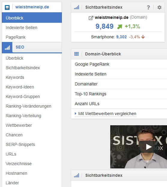 - Sichtbarkeitsindex: Um die Auffindbarkeit einer Domain in den organischen Suchergebnisseiten von Google zu prüfen, kann der SISTRIX Sichtbarkeitsindex herangezogen werden.
