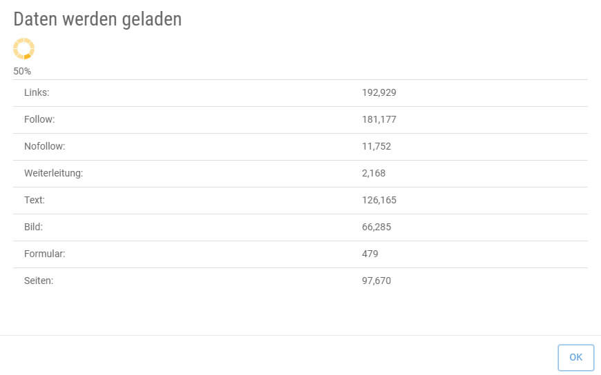 Je nach Größe des zu analysierenden Link- und Backlinkprofils kann das Abfragen der Daten eine Weile dauern. Besonders bei erstmaligem Einholen der Linkstruktur benötigt der XOVI Backlink Checker einige Sekunden, bis alles vollendet ist. Um die Wartezeit zu überbrücken wird eine Ladegrafik angezeigt, die die gefundenen Links und auch andere Informationen zählt.