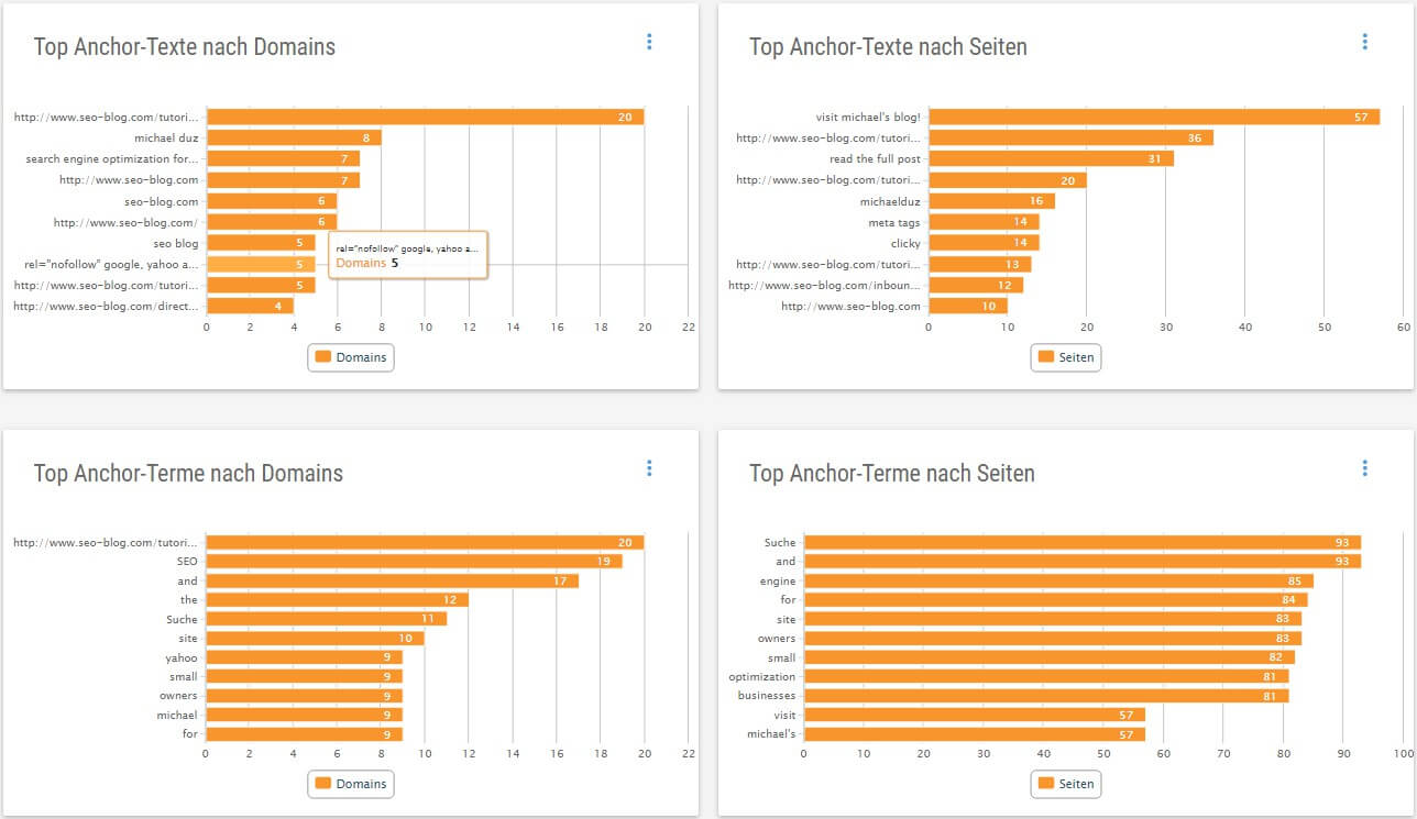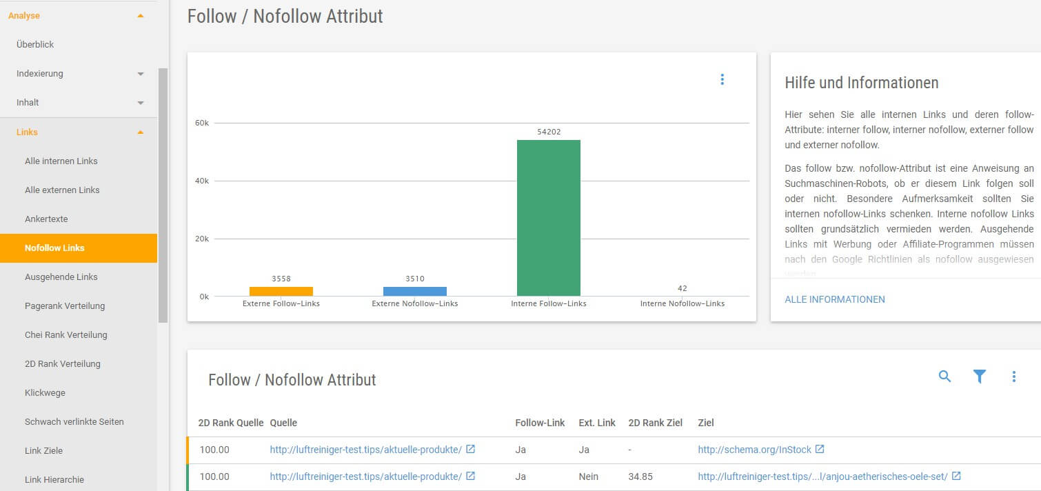 Selbstverständlich beherrscht die XOVI Onpage Analyse noch deutlich mehr, als die eben genannten Funktionen. Auch Links können damit bestens analysiert und aufgeschlüsselt werden. Dabei werden interne, externe, Anker- und Nofollow-Links beachtet. Grafiken zeigen optisch auf einen Blick, welches Bild auf der analysierten Webseite vorherrscht. Weitere Details erhält man jederzeit mit Hilfe der spezifischen Verteilungsoptionen.