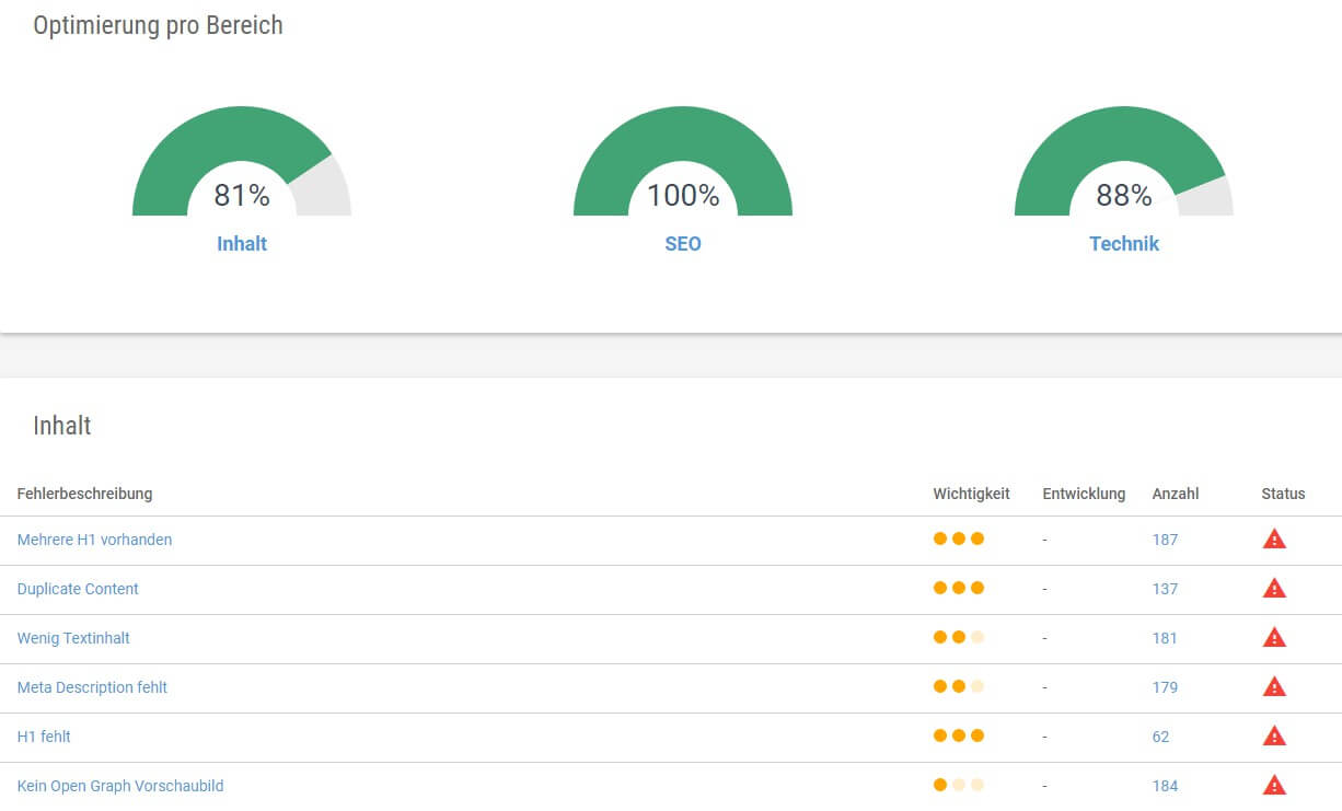 Diverse SEO online Checks bieten die Möglichkeit, Websites auf semantische Korrekheit zu prüfen. Auch SEO Analysen können dabei durchgeführt werden. Viele kostenlose SEO Checker leisten dabei sehr gute Arbeit. Trotzdem ist es erfreulich mit der XOVI Onpage Analyse alles in einem Tool zu haben. Inhalte, SEO Faktoren, optische Darstellung und technische Aspekte werden geprüft. Eine Besonderheit gegenüber den meisten kostenlosen SEO Check Tools stellt die Gewichtung der gefundenen Probleme dar. Es wird nicht einfach nur aufgezeigt, dass oder welches Problem besteht. Basierend auf aktuellen Erkenntnissen wird eine Berechnung durchgeführt, die den Schweregrad des Vergehens feststellt. Auf diese Weise können Ressourcen für die Behebung von Gefundenem sinnvoll eingeteilt werden. Einerseits kann man zeitkritische Punkte sofort angehen. Andererseits können leicht zu behebende Aspekte rasch behoben werden.