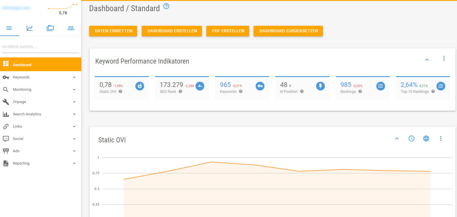 Ein Muss für jedes SEO Analyse Tool ist ein übersichtliches Dashboard. Aus diesem Grund weist natürlich auch XOVI eines auf. Es wird als Startseite nach dem Login verwendet und zeigt in erster Linie wichtige Performance Indikatoren. Dazu zählen vor allem Informationen rund um relevante Keywords, Rankingverläufe, Link Performance Indikatoren, Auf- und Absteiger in Sachen Suchbegriffe und relevante Subdomains. Sollte man mit dem Standard-Dashboard nicht zufrieden sein, kann man jederzeit selbst eines erstellen. Das voreingestellte Dashboard zielt auf die Suchmaschinenergebnisse einer spezifischen Landeseinstellung ab. Es werden also nicht die Gesamtdaten geliefert, sondern beispielsweise jene für Google.de. Ein tolles Extra ist hier gegeben, da nicht nur die Google Suchmaschinenresultate in vielen Sprachen verfügbar sind, sondern auch die deutsche Bing.com Website. Auch wenn die Bing Suchmaschine einen deutlich geringeren Marktanteil aufweist, als Google, ist sie dennoch ein nennenswertes Tool. Die Beachtung alternativer Suchmaschinen lassen viele SEO Werkzeuge völlig außer Acht, wie beispielsweise die Gegenüberstellung von XOVI mit dem Konkurrenzprodukt SEMrush zeigt. Das kann jedoch für das Ranken von Nischenseiten oder -produkten eine wichtige Onlinemarketinstrategie sein. Aus diesem Grund haben wir diese Grundfunktion im XOVI Test sehr begrüßt.