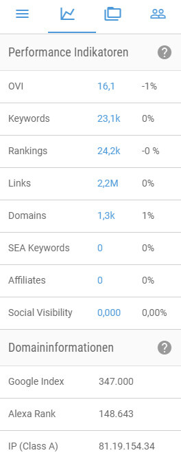 Im Rahmen des XOVI Tests wurde bereits mehrfach erwähnt, dass die SEO Suite ein hohes Maß an Benutzerfreundlichkeit aufweist. Eine einfache Menüführung, bei der stets verständlich ist, wo man sich befindet und was man nach einem Klick zu erwarten hat, trägt dazu maßgeblich bei. Im Menü ist nicht nur eine klassische, hierarchisch organisierte Struktur gegeben. Auch eine Unterteilung in vier Geschwisterkategorien – oder besser gesagt Ansichten – ist gegeben. Das ist einerseits die Navigation selbst, Performance Indikatoren folgen zur Rechten, danach kommen angelegte Projekte und schlussendlich noch Benutzer. Optisch ist das XOVI Tool – wie auf den Screenshots ersichtlich – sehr schlicht aufgebaut. Das beugt einer möglichen Überladung aufgrund großer Charts und Trendanalysen vor. Aus Sicht der Performance gibt es am SEO Werkzeug nichts zu kritisieren. Da die XOVI GmbH bereits langjährige Erfahrung mit SaaS-Lösungen aufweist, scheinen Themen wie Geschwindigkeit und Antwortzeit kein Problem zu sein. Das ist ein wichtiger Faktor, zumal unter entsprechenden Problemen vor allem kostenlose Dienste leiden. Was man in Sachen Benutzerfreundlichkeit als kleine Schwachstelle bezeichnen könnte, ist die Tatsache, dass ohne der manuellen Einrichtung von Domains relativ wenig Daten verfügbar sind. Das ist zwar nachvollziehbar, manche Konkurrenztools lösen das aber in Form von Standardabfragen, um zumindest den Bildschirm zu füllen, bis man konkrete Wünsche äußert.