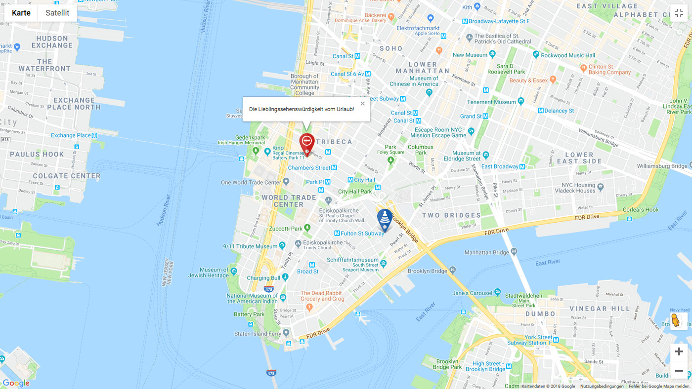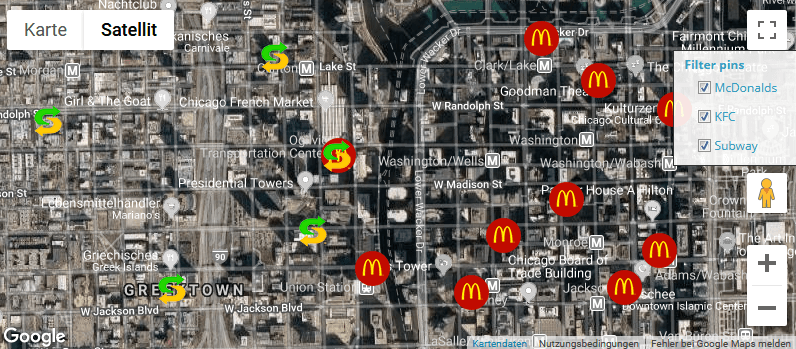 Zusätzlich ist die Auswahl an Karten-Pins, also den Nadeln, die einen Ort anzeigen, enorm. Zusätzlich können diese an individuelle Bedürfnisse angepasst werden. Das ist vor allem dann hilfreich, wenn ein Logo oder ein Symbol eines lokalen Unternehmens oder einer kleinen Kette eingebunden werden soll. Ein Maximum an gleichzeitig einsetzbaren Karten-Pins gibt es nicht. Sollte man unterschiedliche Zielgruppen gleichzeitig bedienen wollen, kann man die Entscheidung der Ansicht auch gerne den Benutzern überlassen. So können Auswahlflächen zwischen Satelliten- oder Straßenansicht, Zoom-Buttons, Möglichkeiten zum Wechsel in die Street-View und weitere Einstellungen auf Wunsch ein- oder ausgeblendet werden.