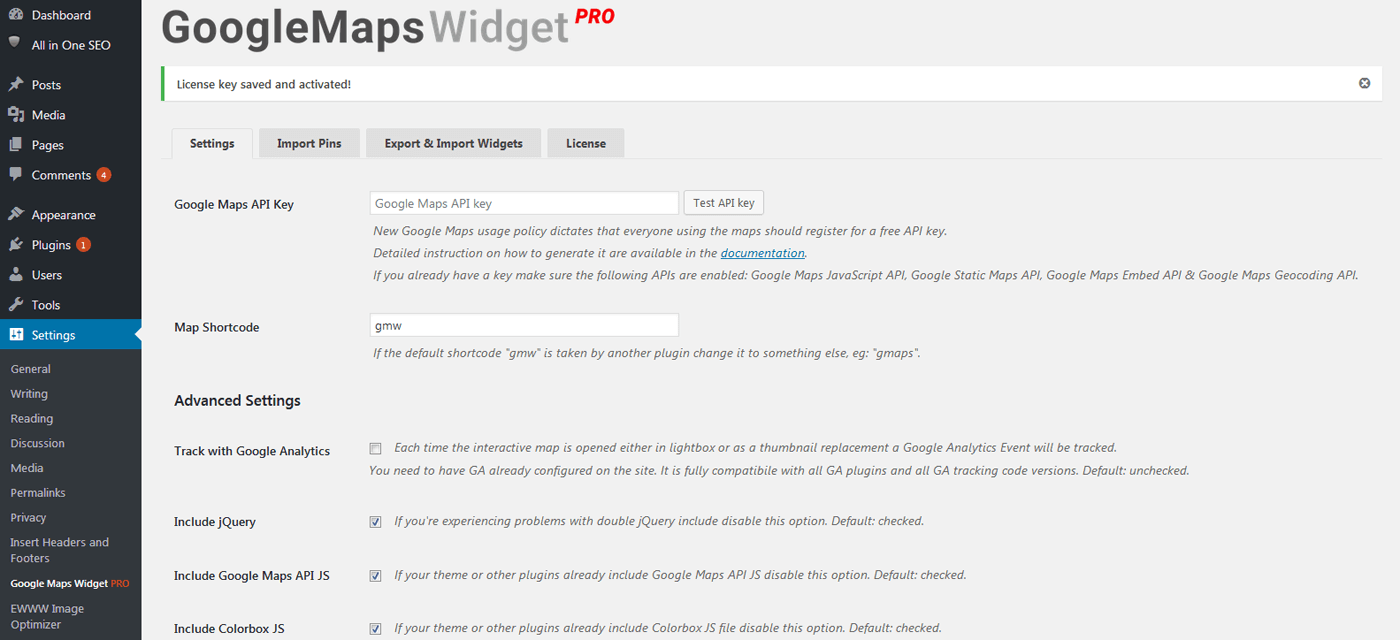 - Das installierte Plugin befindet sich unter dem Punkt „Einstellungen“ -> „Google Maps Widget“