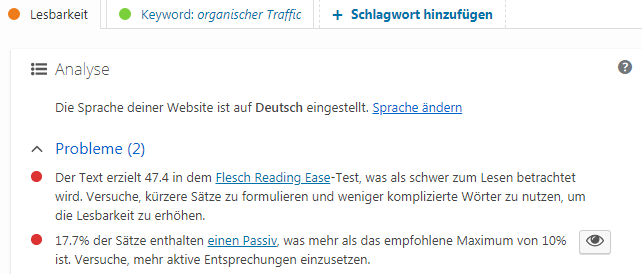 - Gute Option für Keyword-Beurteilung und Lesbarkeitsanalyse