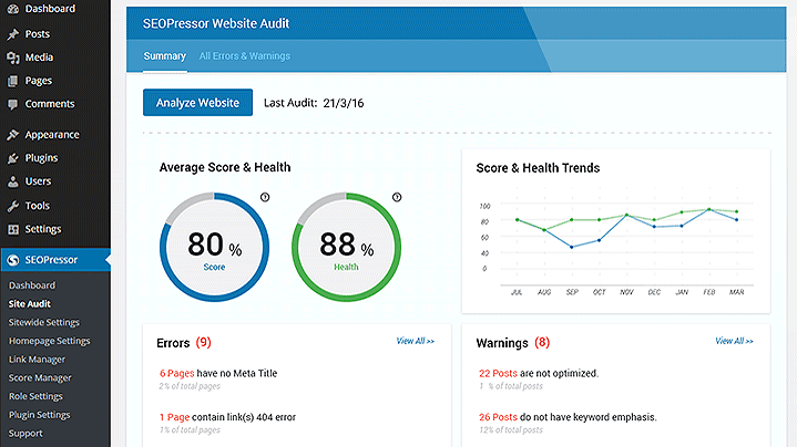 Hinter dem Namen SEOPressor verbirgt sich ein sehr einfach aufgebautes, gleichzeitig aber äußerst mächtiges SEO Tool für WordPress. Bereits die Übersicht im Dashboard gibt alle notwendigen Daten wieder. Mit einer regelmäßigen Analyse wird die eigene Website in zwei Werte gegliedert. Einerseits gibt es einen allgemeinen Wert, der Geschwindigkeit und Probleme beurteilt. Andererseits gibt es einen Health-Wert, der semantische und strukturelle Probleme der WordPress-Website aufzeigt. Als besonders nennenswert ergab sich im SEOPressor Test, dass abseits dieser bereits nützlichen Funktionen noch viele weitere geboten werden. So kann man interne Link- und seitenweite SEO-Einstellungen im Nu treffen. Sofern mehrere Personen mit der SEOPressor-Installation arbeiten sollten, kann man die Rollen klar aufteilen.